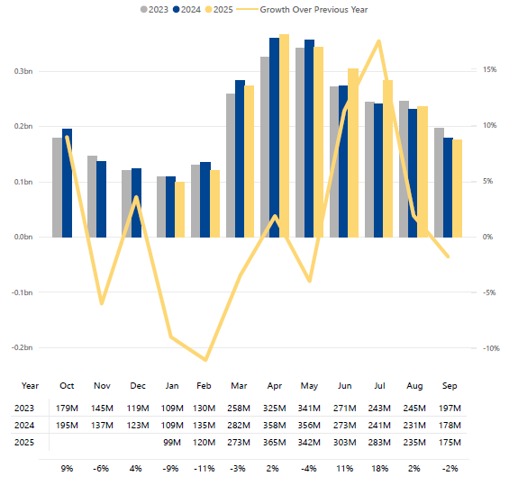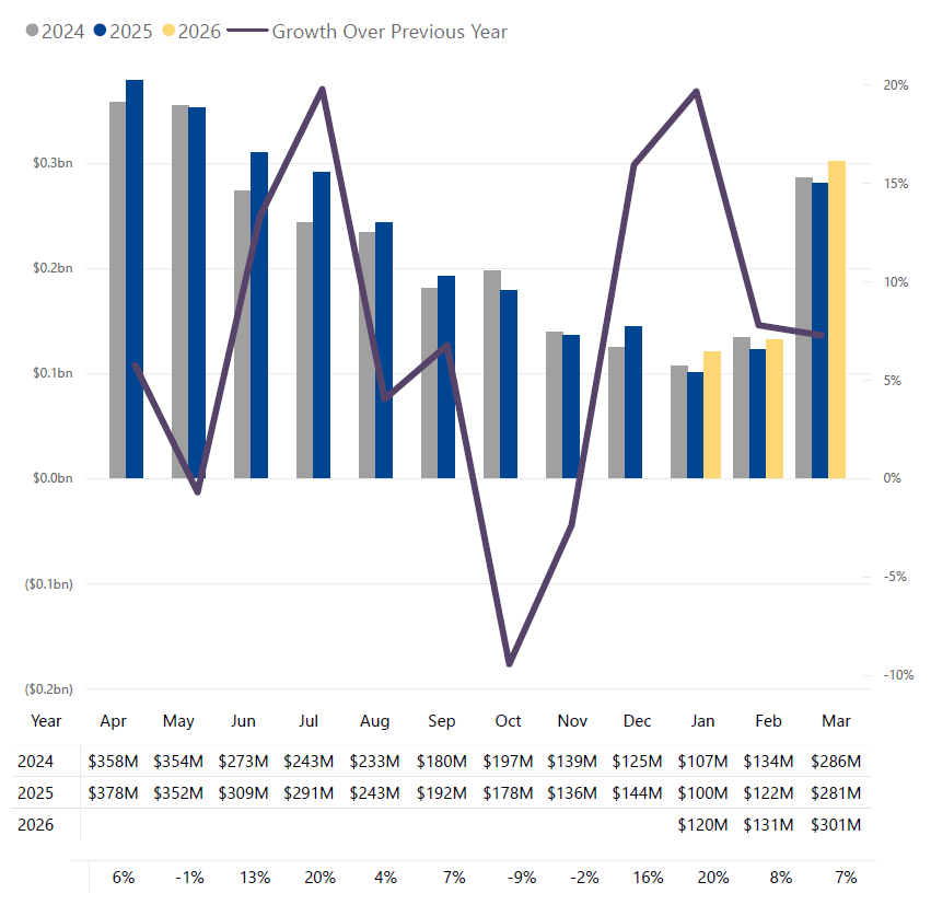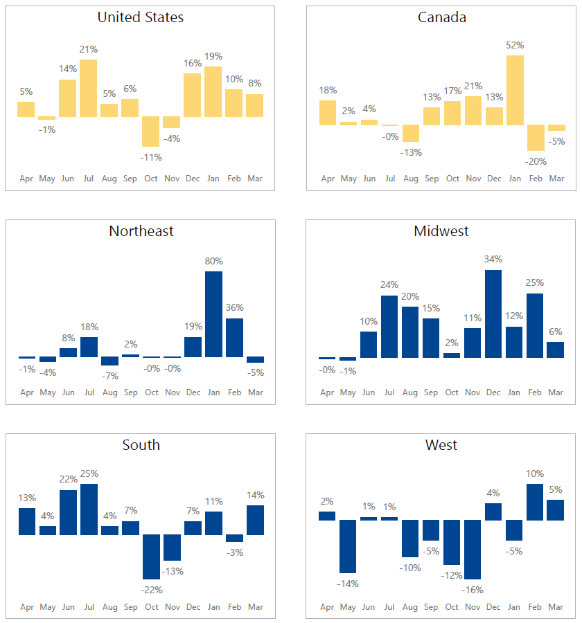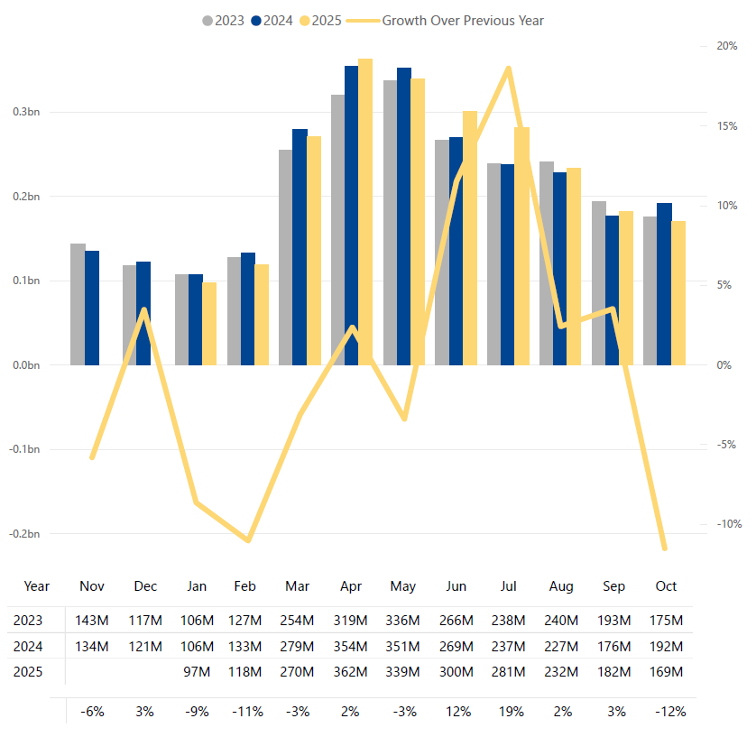 - The report is showing a year over year average with a yellow line indicating the current year performance over the previous year.
