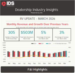 IDS recently launched Dealership Industry Insights, a monthly report that includes unit sales and F&I insights, in addition to RECT benchmarks, based on aggregated data from RV dealerships nationwide. The latest dealership insights are on the right, and the region-wise RECT report is below.