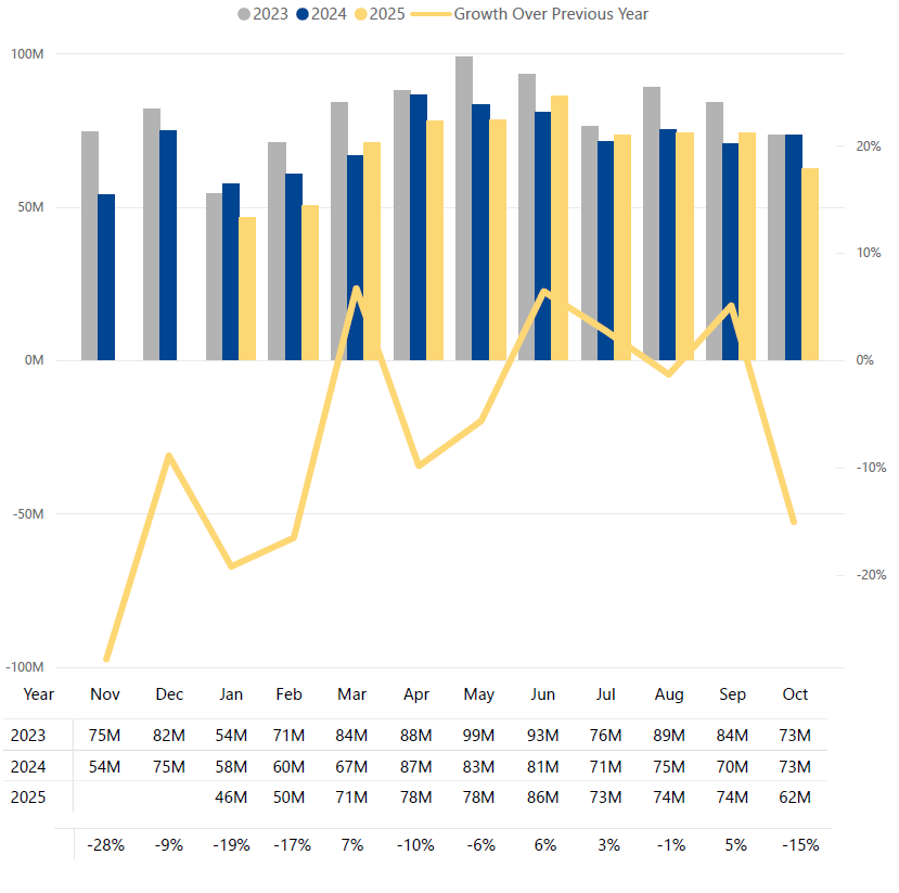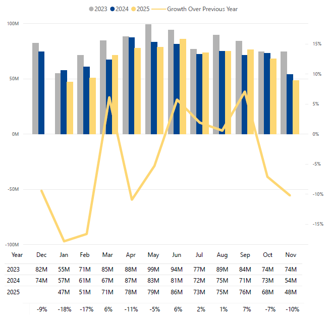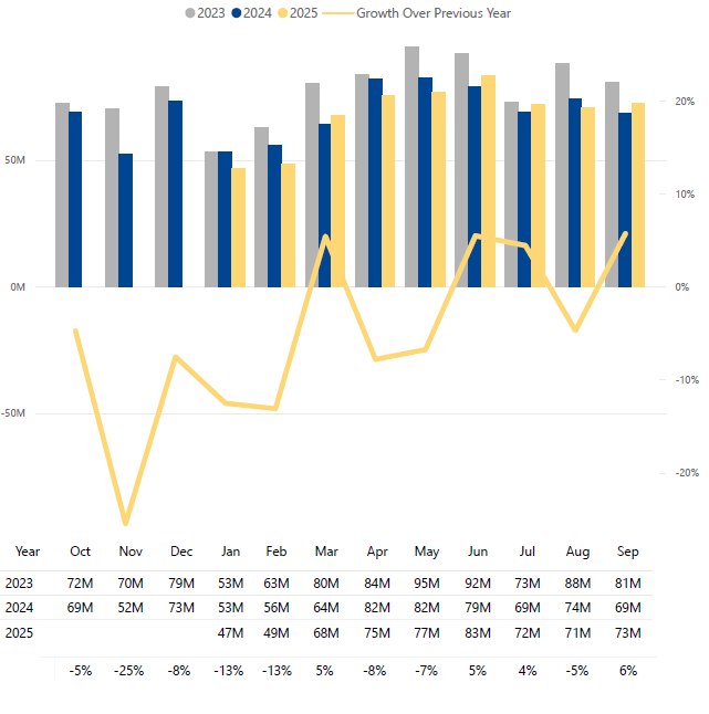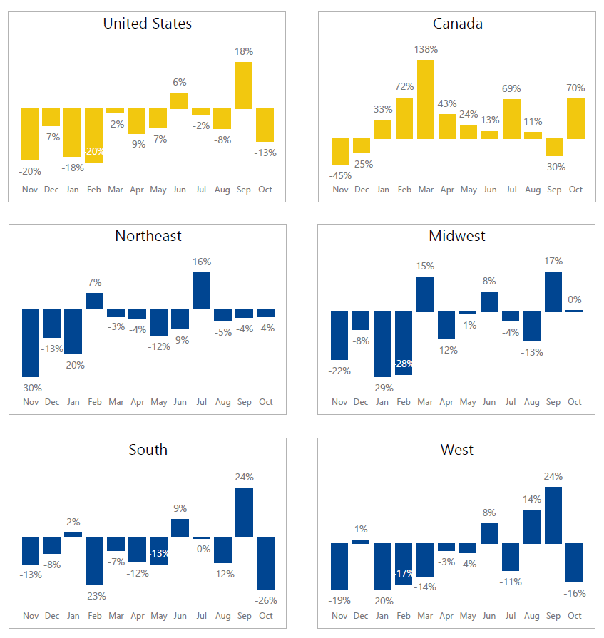 - The report is showing a year over year average with a yellow line indicating the current year performance over the previous year.